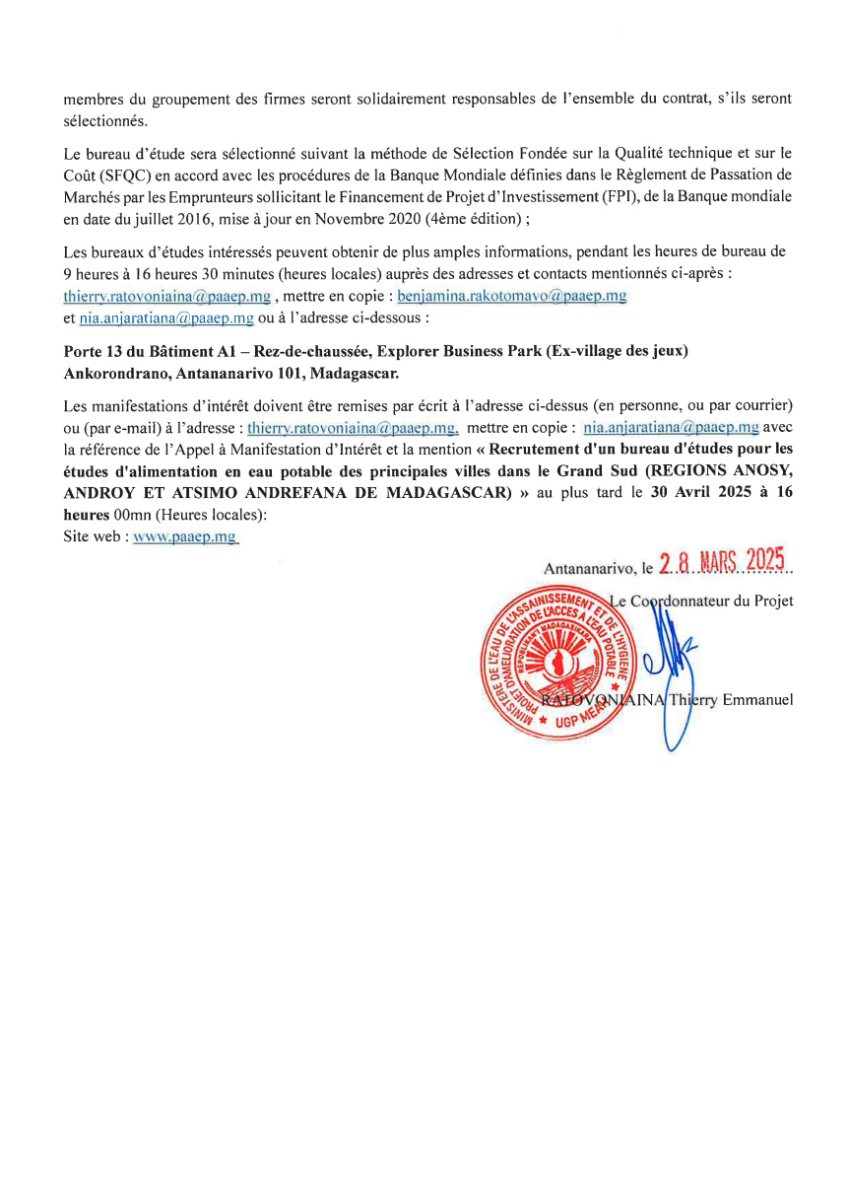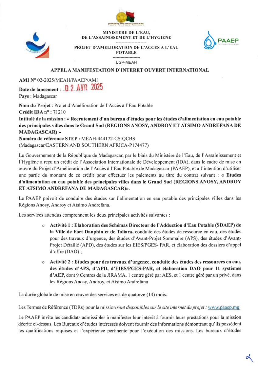 APPEL A MANIFESTATION D'INTERET N°: 01-2025/MEAH/PAAEP/AMI pour RECRUTEMENT D'UN BUREAU D'ETUDES POUR LES ETUDES D'ALIMENTATION EN EAU POTABLE DES PRINCIPALES VILLES DANS LE GRAND SUD (REGIONS ANOSY, ANDROY ET ATSIMO ANDREFANA DE MADAGASCAR)