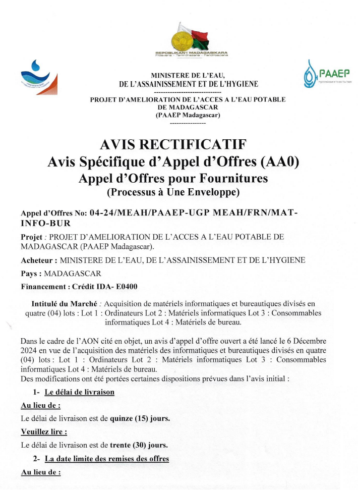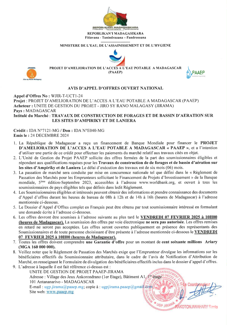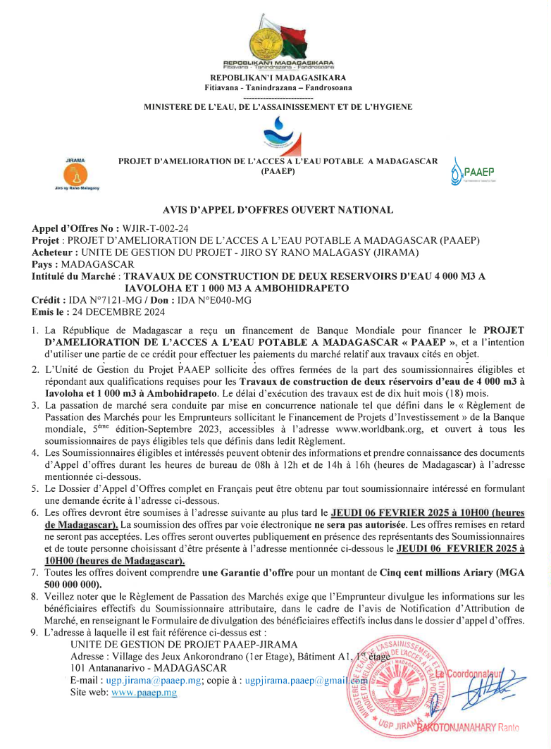 PAAEP - UGP JIRAMA | Avis d'appel d'offres ouvert national N° : PAAEP- WJIR-UCT2-24 : TRAVAUX DE CONSTRUCTION D'UNITES COMPACTES DE TRAITEMENT D'EAU A MANDROSEZA ET PERIPHERIES | PAAEP - UGP JIRAMA | Avis d'appel d'offres ouvert national N° WJIR-T-UCT1-24 : TRAVAUX DE CONSTRUCTION DE FORAGES ET DE BASSIN D’AERATION SUR LES SITES D’AMPIRIKY ET DE LANIERA | PAAEP - UGP JIRAMA | Avis d'appel d'offres ouvert national N° : WJIR-T-002-24 : TRAVAUX DE CONSTRUCTION DE DEUX RESERVOIRS D'EAU 4000 M3 A IAVOLOHA ET 1000 M3 A AMBOHIDRAPETO