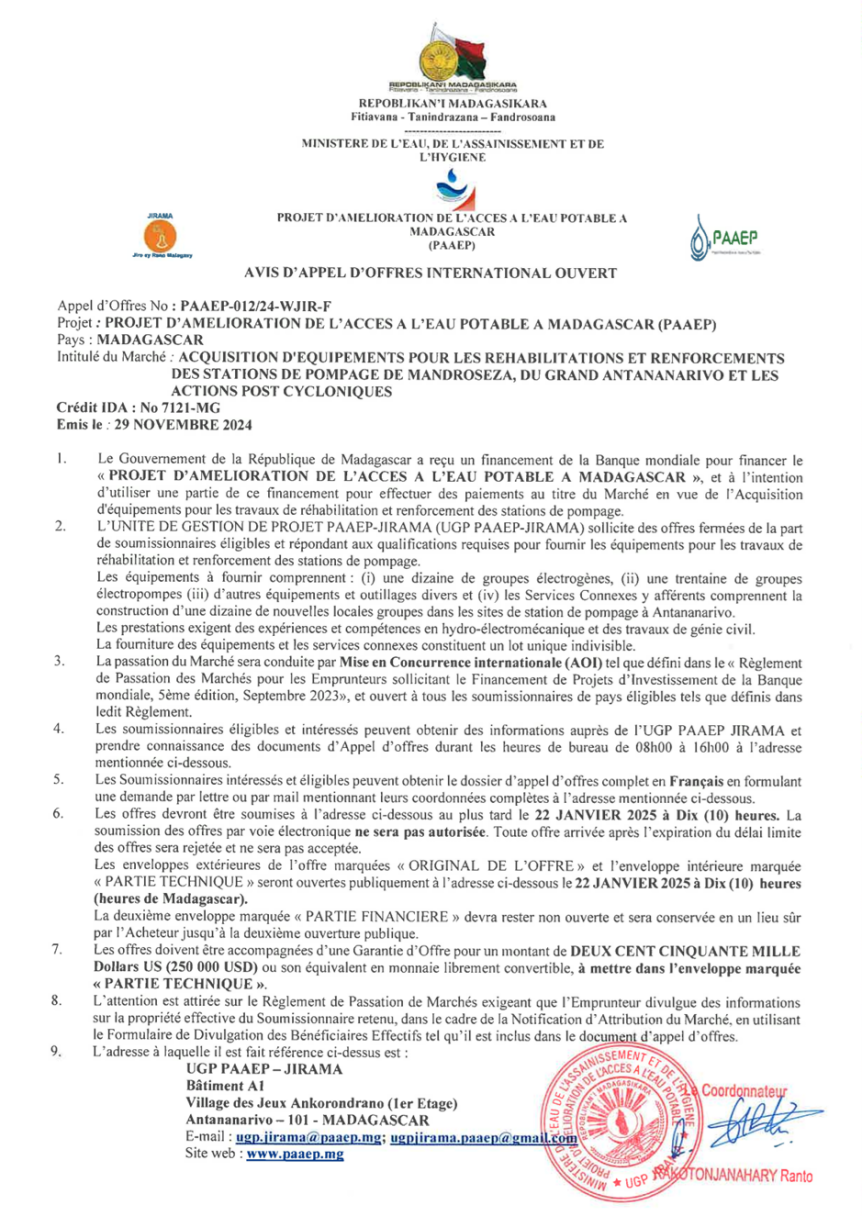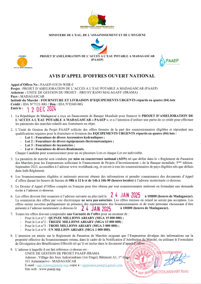 PAAEP - UGP JIRAMA | Avis d'appel d'offres international N° : PAAEP-012/24-WJIR-F