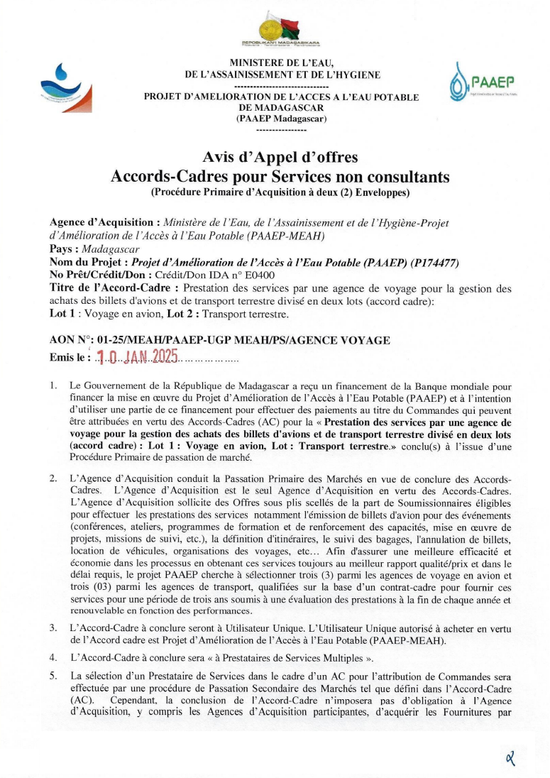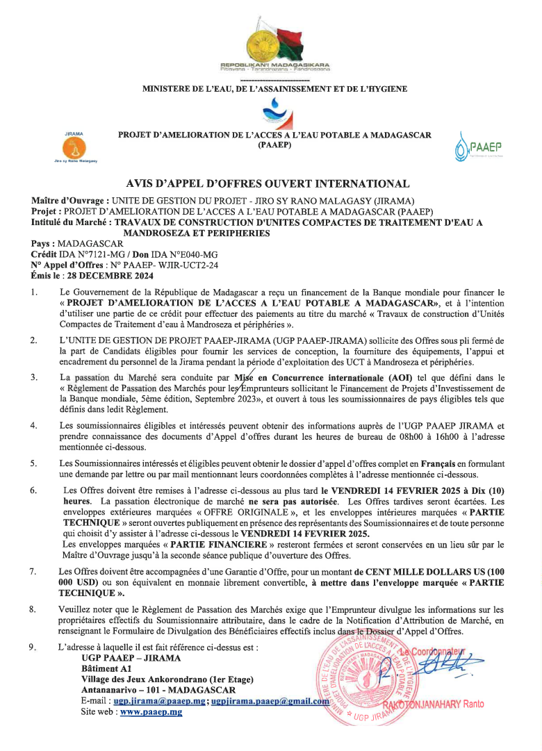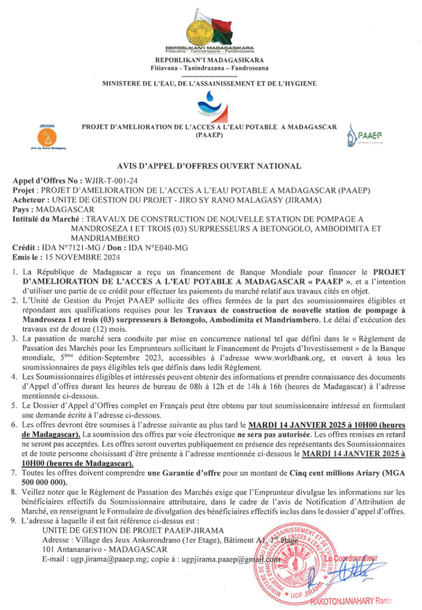 PAAEP - UGP JIRAMA | Avis d'appel d'offres ouvert national N° : PAAEP- WJIR-UCT2-24 : TRAVAUX DE CONSTRUCTION D'UNITES COMPACTES DE TRAITEMENT D'EAU A MANDROSEZA ET PERIPHERIES | PAAEP - UGP JIRAMA | Avis d'appel d'offres ouvert national N° WJIR-T-UCT1-24 : TRAVAUX DE CONSTRUCTION DE FORAGES ET DE BASSIN D’AERATION SUR LES SITES D’AMPIRIKY ET DE LANIERA | PAAEP - UGP JIRAMA | Avis d'appel d'offres ouvert national N° : WJIR-T-002-24 : TRAVAUX DE CONSTRUCTION DE DEUX RESERVOIRS D'EAU 4000 M3 A IAVOLOHA ET 1000 M3 A AMBOHIDRAPETO