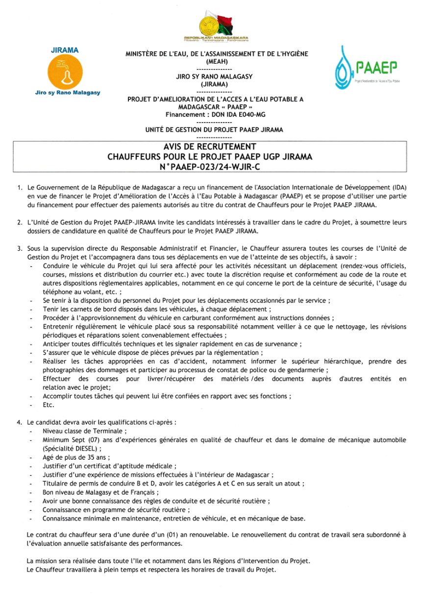 AVIS DE RECRUTEMENT CHAFFEURS POUR LE PROJET PAAEP JIRAMA ROULEMENTS