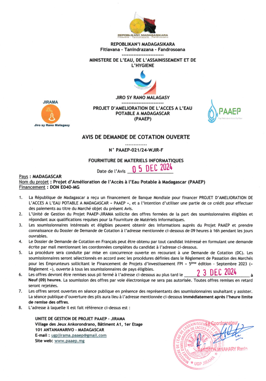 PAAEP - UGP JIRAMA | Avis de demande de cotation ouverte N° : PAAEP-020/24-WJIR-F